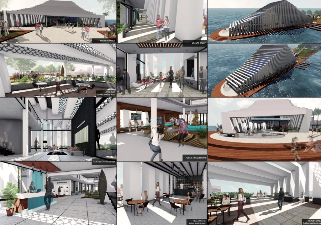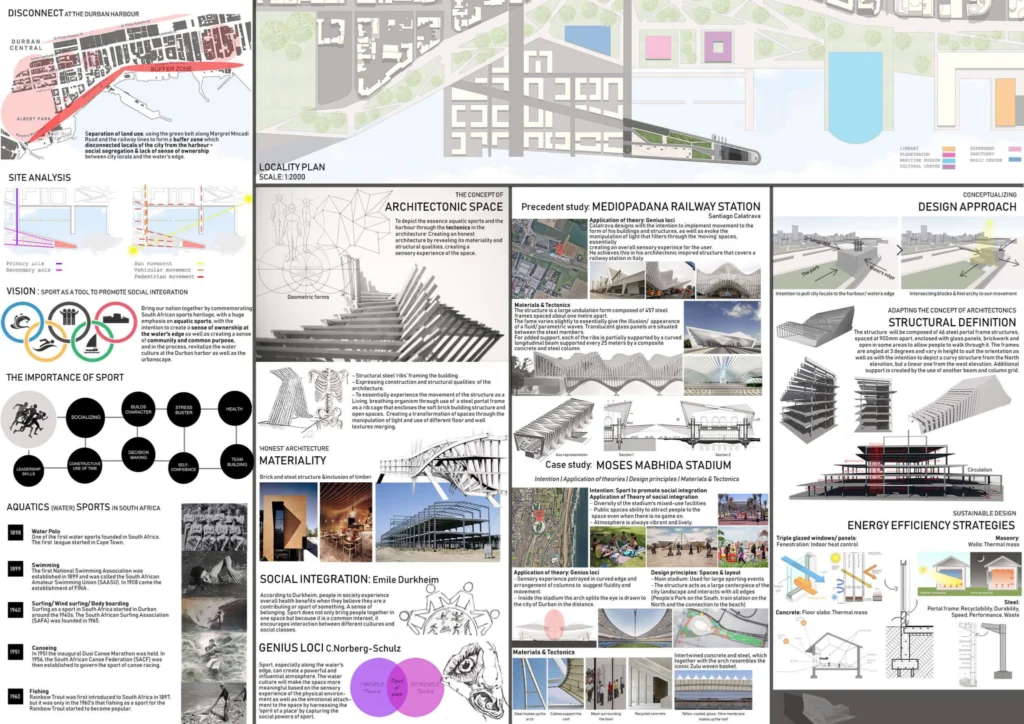 Master of Architecture (Project B) envisions transforming Durban’s urbanscape into a sustainable, community-integrated model by linking the harbor to the urban realm at a human scale. Through an eco-systemic design approach, the concept fosters social exchange, ownership, and economic growth. Sport, particularly South African aquatic sports, serve as a catalyst for social integration, reconnecting the inner city with the harbor while revitalizing Durban’s water culture.