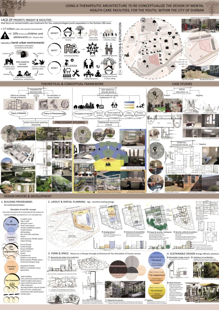 Master of Architecture (Thesis Project) explores the mental health care phenomenon in South Africa, with specific focus on children and adolescents in underprivileged communities. The research sets out to explore a de-institutionalized approach as an alternative response to the design of existing mental health facilities for the youth. In addition to discovering how they can be improved through a mixed-use housing facility that would engage with its community; as opposed to an isolated institutionalized facility. The primary objective being to demonstrate that a healing and therapeutic environment can be achieved within an urban setting, and has the potential to create more effective and long-term positive impacts on both the individual and community.