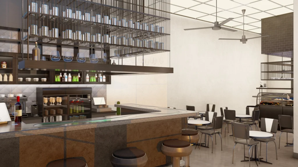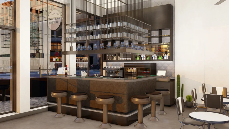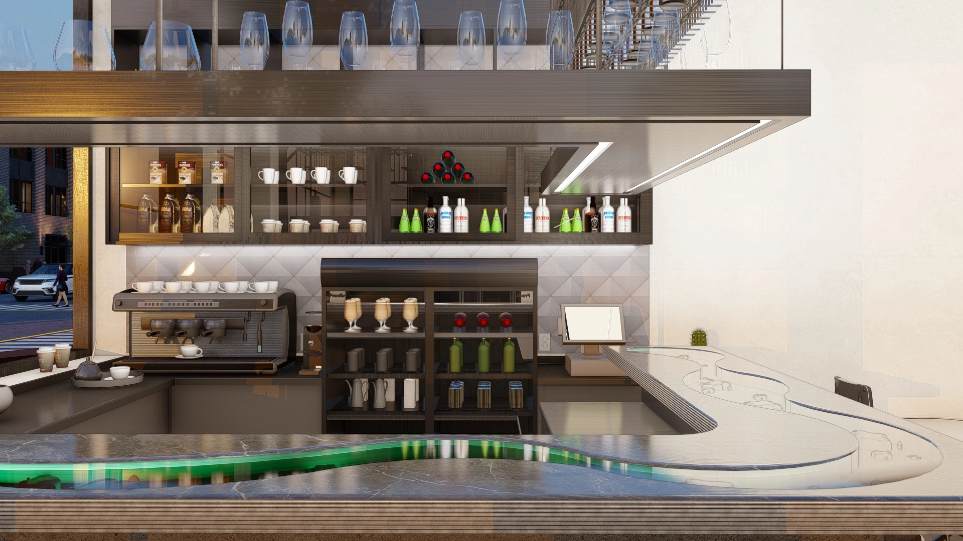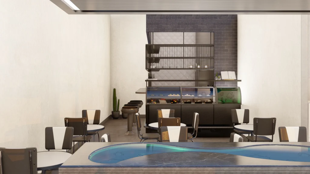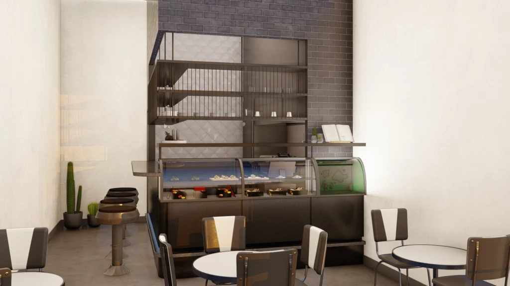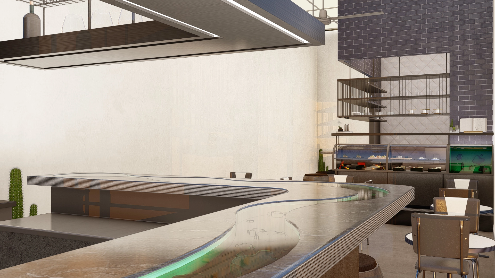 A redesign of a multifunctional space that combines a store, restaurant, and bar. The client envisioned a minimalistic and industrial design with unique character, contrasting the sleek and modern retail area (in progress). The restaurant features a blend of South American and Japanese cuisine, an open kitchen for customer viewing, and the bar includes a custom-designed countertop with a built-in ferrous liquid speaker. This innovative feature integrates a glass strip with magnetic liquid, backlit with changeable colors, functioning as a cymatics system synchronized to music.