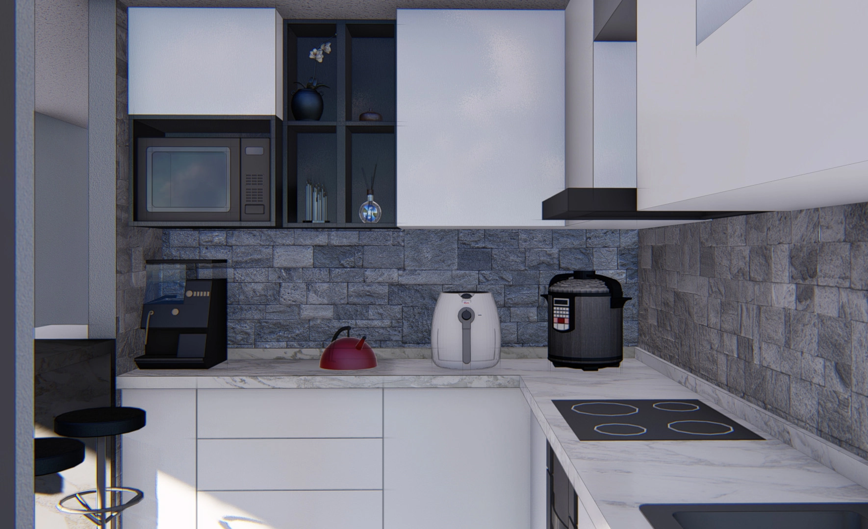 Renovation to an existing dining area and kitchen to achieve a sleek, modern design featuring glossy white and dark grey cabinets, a textured backsplash, and granite countertops. Custom modular cabinets, cupboards, a server, and display shelves are incorporated to maximize storage space.